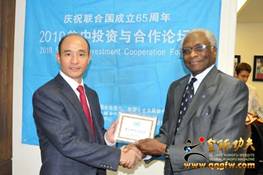 联合国友好协会主席布朗先生为傅彪颁发友好使者证书 |