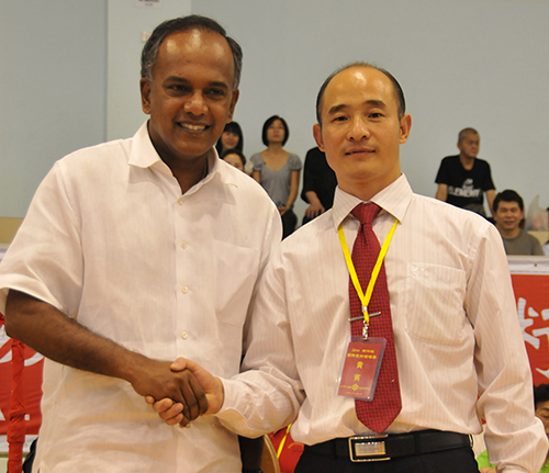联合国友好使者、中国武术协会特邀副主席、国际功夫联合会主席、全球金融集团总裁傅彪先生(右)与新加坡内政部部长、律政部部长尚穆根先生(K.Shamugen)。 |