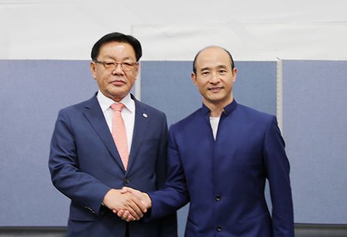 联合国友好使者、中国武术协会特邀副主席、国际功夫联合会主席、全球金融集团总裁傅彪先生会见韩国鸡龙市市长崇宏募先生。 |