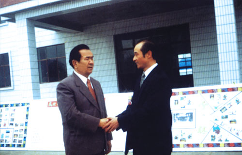 1999年5月18日全国人大副委员长铁木尔·达瓦买提参加365bet国际赌场新校落成典礼活动时与傅彪先生亲切握手。 |