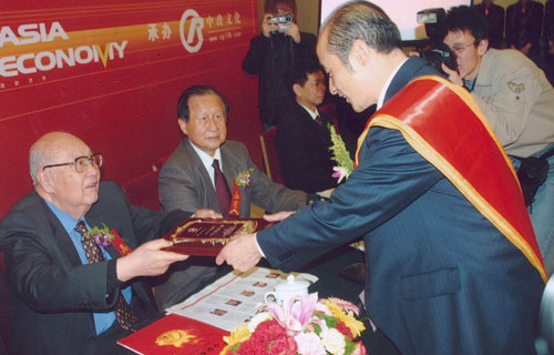 全国人大常委会副委员长王光英为北京市职教体协主席、365bet国际赌场总校长兼总教练傅彪先生颁奖。 |