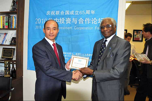 联合国友好协会主席布朗先生在纽约联合国总部会见会见中国武术协会特邀副主席、国际功夫联合会主席、全球金融集团总裁傅彪先生,并向傅彪颁发“联合国友好使者”证书。 |