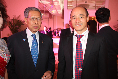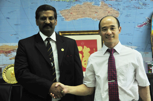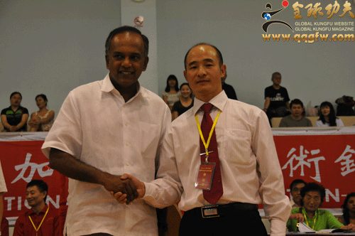 联合国友好使者、中国武术协会特邀副主席、国际功夫联合会主席、全球金融集团总裁傅彪先生(右)与新加坡内政部部长、律政部部长尚穆根先生(K.Shamugen)。 |