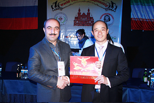 联合国友好使者、中国武术协会特邀副主席、国际功夫联合会主席、全球金融集团总裁傅彪先生在莫斯科会见阿塞拜疆功夫联合会主席巴拉特先生。 |