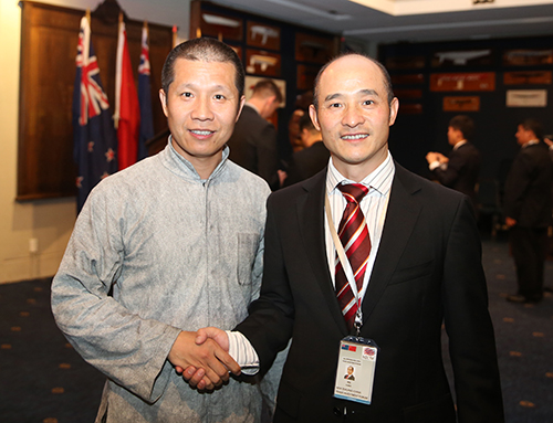 联合国友好使者、中国武术协会特邀副主席、国际功夫联合会主席、全球金融集团总裁傅彪先生会见新西兰功夫联合会主席洪卫国先生。 |