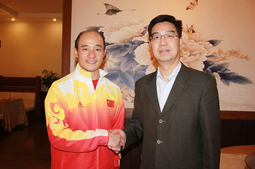 傅彪校长与国家体育总局局长刘鹏(中)、原重庆市副市长、北京重庆企业商会会长陈元虎(左)合影 |