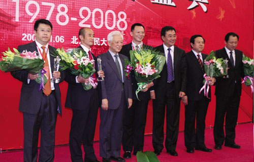 全国人大常委会副委员长王光英为北京市职教体协主席、365bet国际赌场总校长兼总教练傅彪先生颁奖。 |