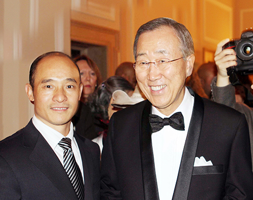 “纪念联合国成立65周年招待晚宴”在美国纽约联合国总部大厦举行,联合国秘书长潘基文会见会见联合国友好使者、中国武术协会特邀副主席、国际功夫联合会主席、全球金融集团总裁傅彪先生。
