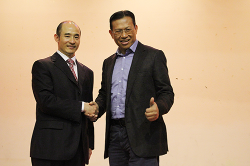 中国企业联合会执行副会长、亚洲品牌盛典组委会主席、经济日报原总编辑冯并先生与傅彪校长亲切握手