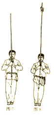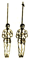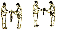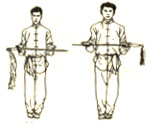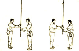 并步直立,两手虎口朝上,上下靠拢,左手在上,靠近递棍者手下部接握;目视双手接棍(图15)