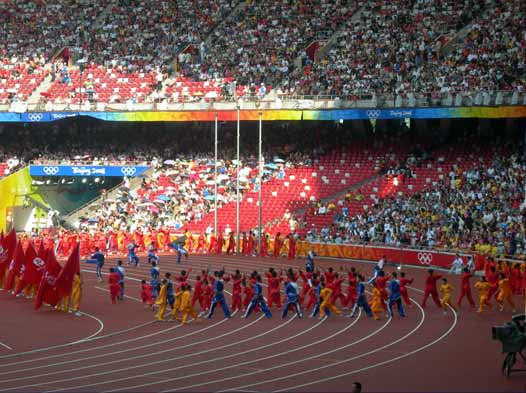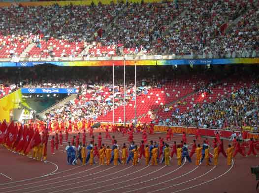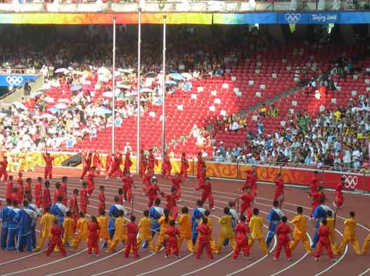 8月24日上午7时30分,奥运会男子马拉松比赛开赛。开赛后半小时,一场声势浩大的展示表演——北京奥运会马拉松赛场全民健身项目展示活动在马拉松比赛终点——国家体育场“鸟巢”内开始了。这次活动是根据中央、北京市和奥组委领导的指示,在国家体育场利用马拉松终点赛场比赛期间较长的空闲时间,为观众呈现民族的、传统的、有特色的全民健身体育项目的展示表演活动。